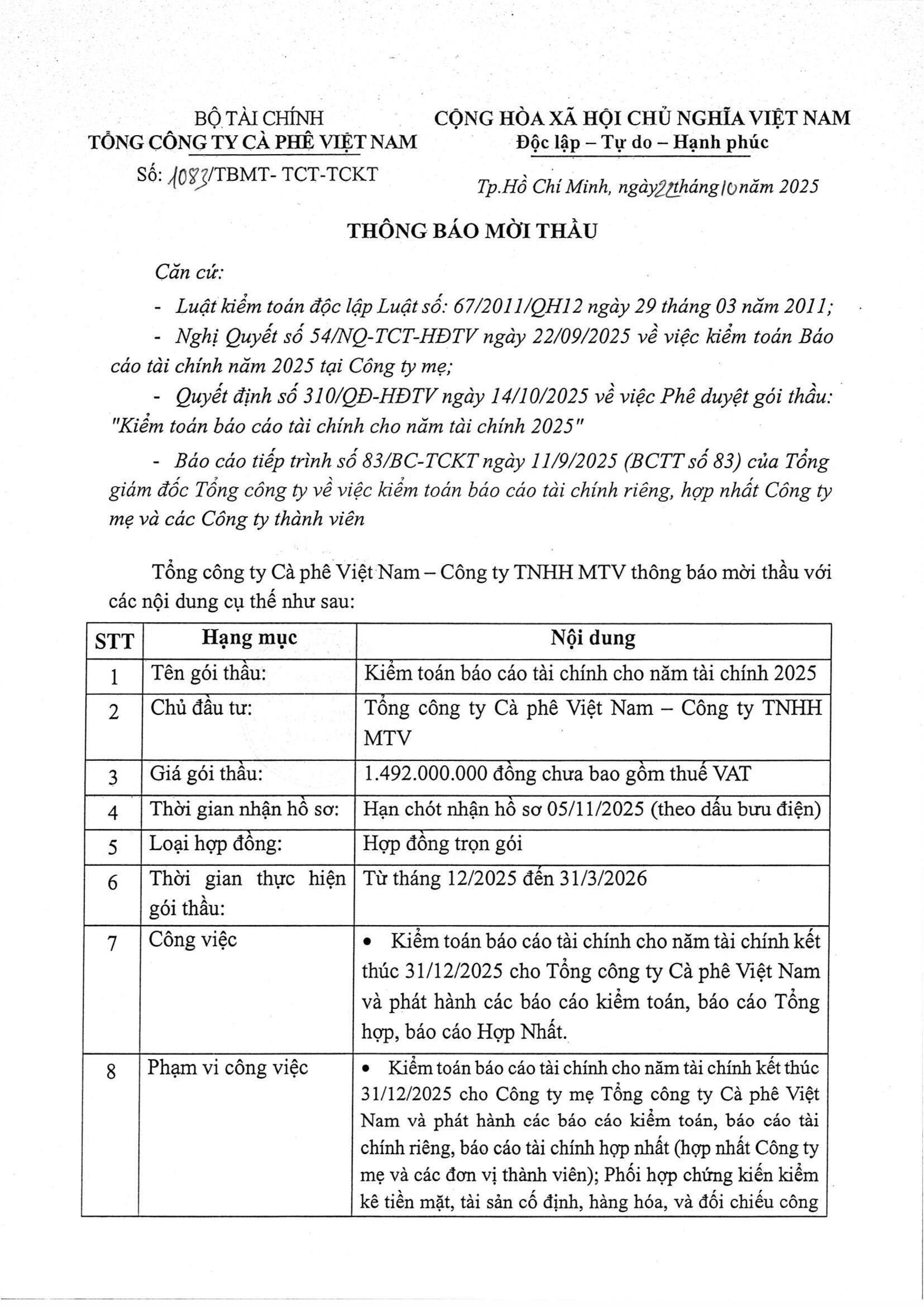 Thông báo mời thầu Gói Kiểm toán BCTC 2025